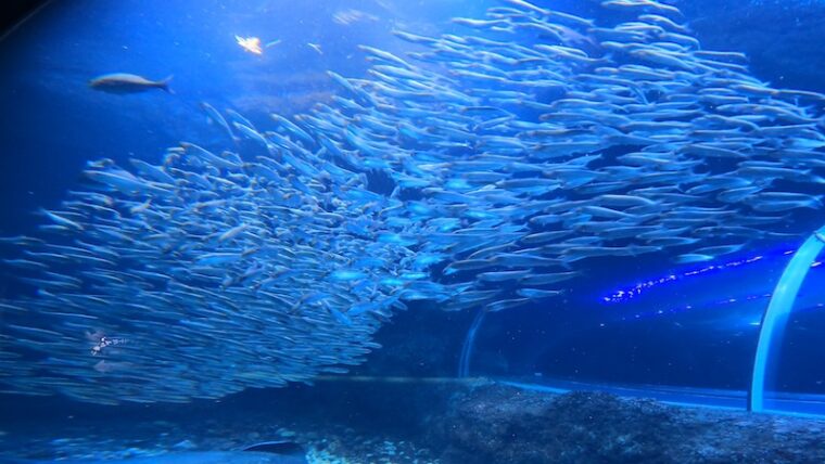 マリンピア日本海でも、大きな塊となって渦を巻くように泳ぐ姿を見ることができます。青魚特有の、光を反射しながらキラキラと輝き泳ぐ大きな塊はとても幻想的で美しく、一見の価値があります。