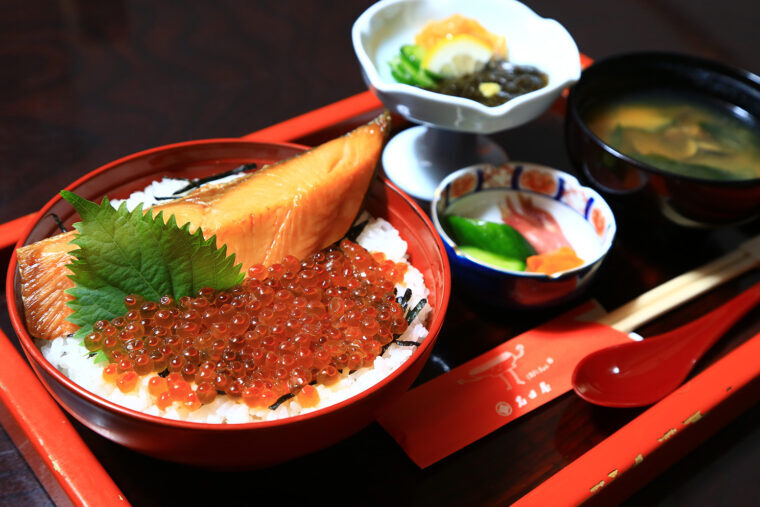 瀬波温泉のある村上市は、古くから鮭との深い結びつきを持つ「鮭のまち」として知られています。特にはらこ(イクラ)をのせた「はらこ丼」は村上屈指の人気グルメ。さらに、北限の茶どころといわれ、市内のお茶屋さんでは江戸時代から栽培が続いている村上茶を味わうこともできます。