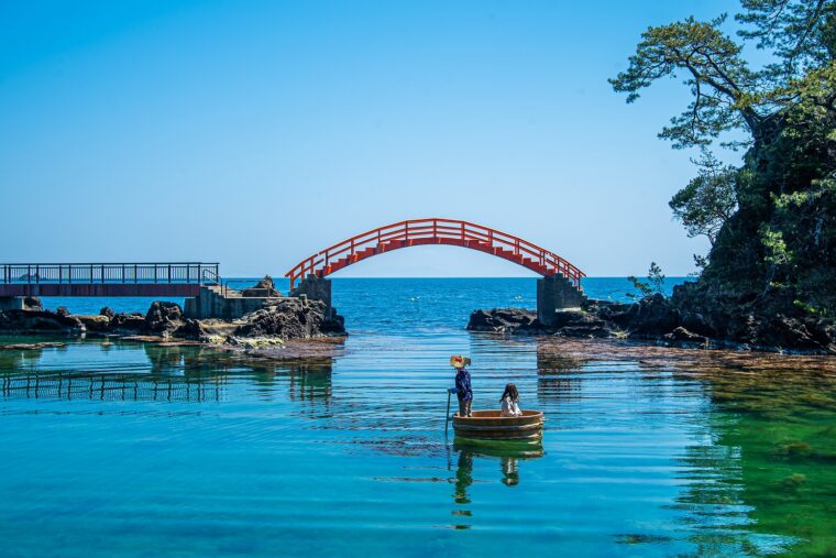また、佐渡でしかできない体験を目的にして旅をするのもありです! たらい舟を知っていますか? 考案は明治初期頃といわれ、ワカメやサザエを採る際に使われてきた小さな舟で、桶を半分に切った形です。フォトジェニックな赤い橋をバックにの~んびり海上さんぽができます。