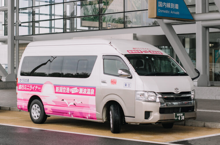 瀬波温泉へのアクセスは、新潟空港からの直行ライナー(要事前予約)が便利。空港から観光地までダイレクトに行けるこの直行ライナーを使って、温泉や海水浴、鮭料理を味わって村上の自然と食を体感する旅にお出かけください。