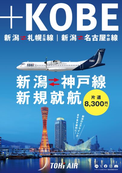 新潟空港を拠点とする航空会社、トキエアがこの春から新たに神戸⇔新潟線を就航しました。現在、金・土・日・月曜の週4便を運航しています。料金は片道8,300円~。これにより神戸をはじめとした兵庫県内、大阪や京都から新潟へのアクセスがますます便利でスピーディになりました。
