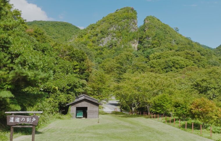 こちらは世界遺産の象徴である「道遊の割戸」。江戸時代の露天掘り跡です。巨大な金脈を掘り進むうちに山がⅤ字に割れたようになったのです!