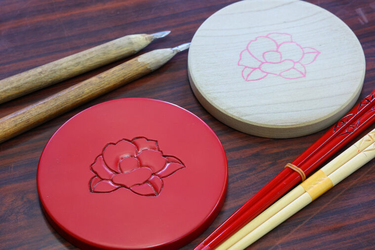 体験は箸と急須台の2種類から選べ、職人から教わりながら彫った後、塗師が丁寧に仕上げてくれ、後日手元に届けてもらえます。