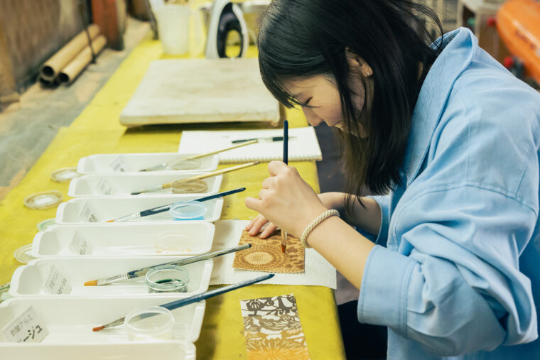 建物の奥にある染色工房では、予約制でハンカチや型染フレームの「北限の茶染」体験を実施。