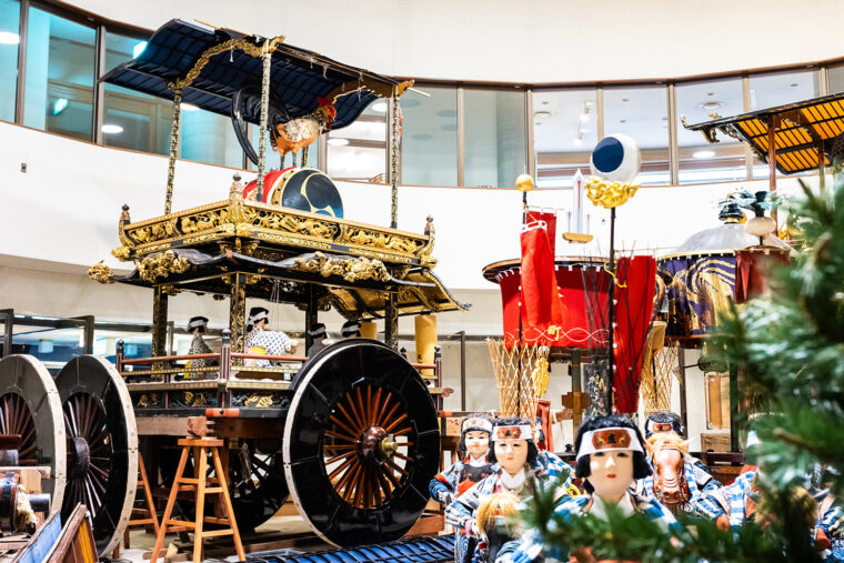 おしゃぎり会館では、実際に祭りで使われている19台のおしゃぎりのうち3台を展示。