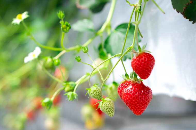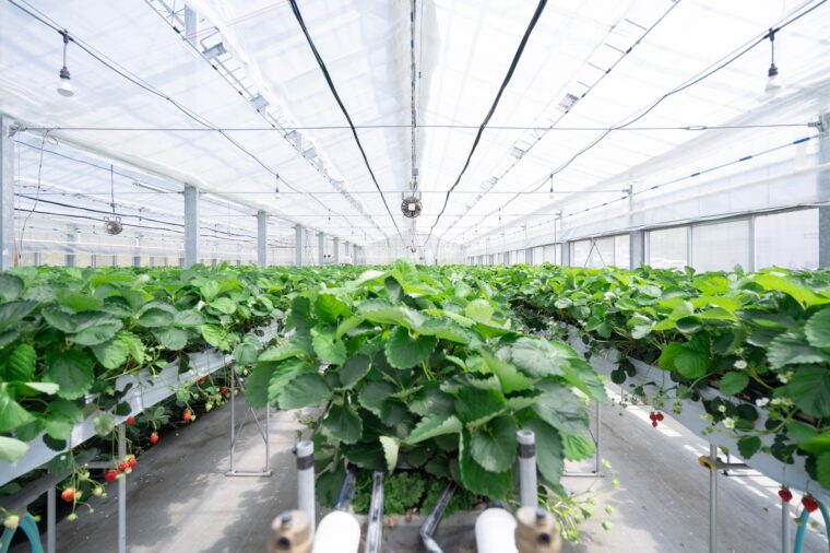 再生可能エネルギーである地中熱を活用した冷暖房システムを利用し、高設栽培されたピーチビレッジファームの農業ハウスで育てたブランドイチゴ、越後姫。