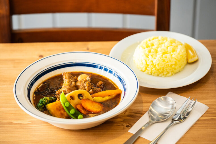 野菜と鶏肉がゴロゴロ入った多幸感あふれるランチメニューで、ライスはおかわり自由です。