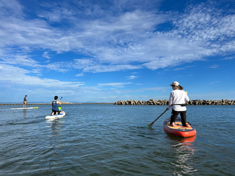 この季節は真っ青な海と一体になれるアクテビティを楽しもうと、関屋浜にある海カフェ、シーポイントニイガタに多くの人が足を運んでいます。なかでも人気は、美しい景色を楽しみながら海上を散歩できるサップ。水面に近い目線で自然をダイレクトに感じれば、このうえない開放感に包まれます。