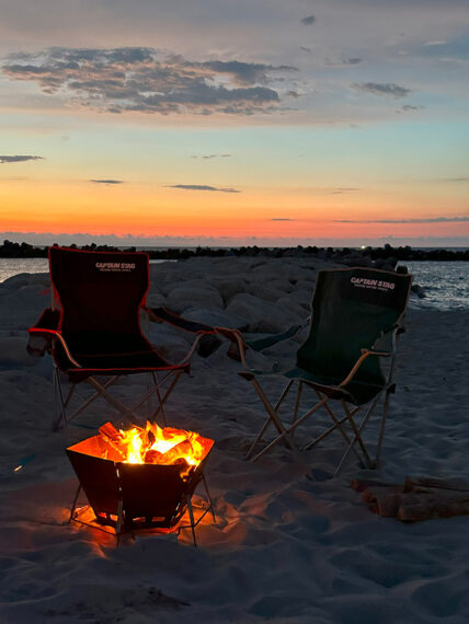 美しい夕日が海に溶け込んだら、砂浜で焚き火を囲みながら一日を締めくくろう。