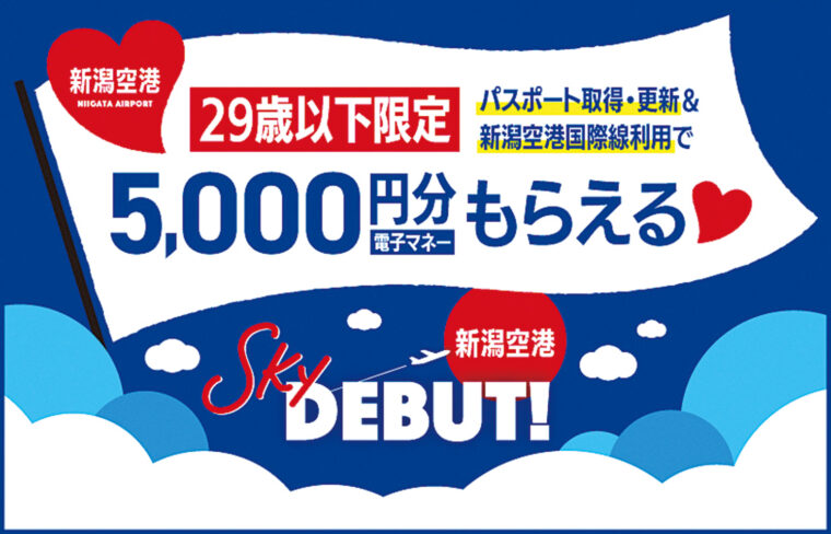新潟空港から国際線を使って海外へ行くと、電子マネーがもらえるキャンペーンを実施しています。