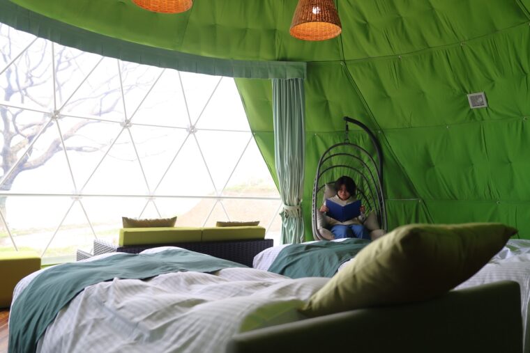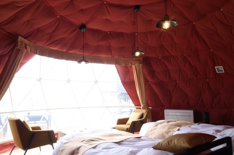 ラグジュアリーな雰囲気のドームテント全7棟には冷暖房を完備。うち2棟はプライベートサウナが付き、また別の2棟はワンちゃん同伴可能、ドッグラン付きの客室となっています。