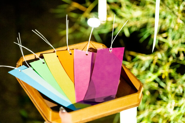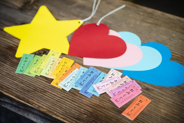 『七夕夏詣』開催期間中に限定で登場する『七夕みくじ』(初穂料300円)は、天の川のようにカラフルなおみくじに、星型やハート型のかわいらしい短冊が付いた特別なセットです。
