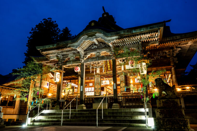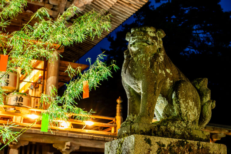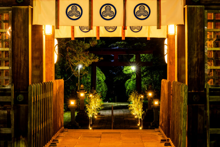 表参道や拝殿には涼やかな笹飾りがしつらえられ、19:30から21:00にはライトアップが実施されます(天候により変動あり)。