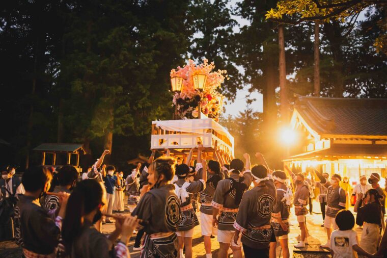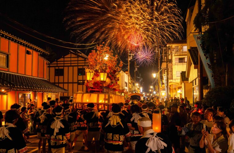花火の打ち上がるなか繰り広げられる大燈籠巡行では、迫力ある光景に出合うことができます。温泉街や神社を練り歩く担ぎ手たちの姿により、活気に包まれること間違いなし!