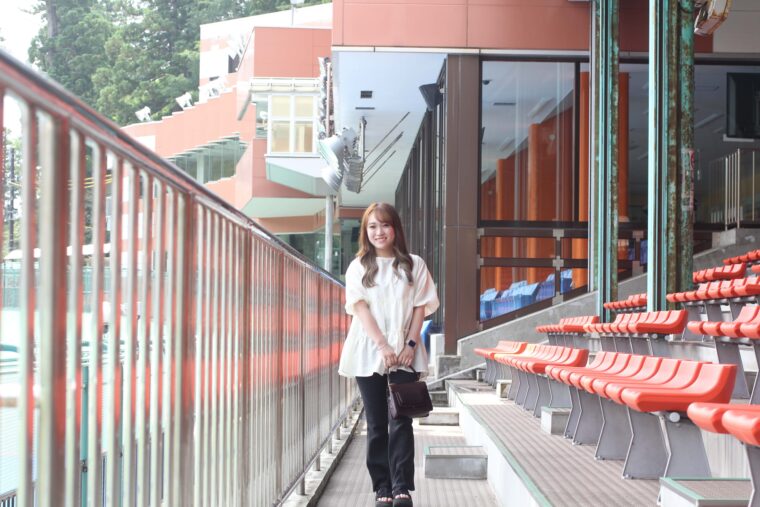 7月11日(金)にバンク内特設ステージでパフォーマンスをするアルビレックスチアリーダーズの渡部杏さんが、ひと足早く、弥彦競輪場を体感してきました!