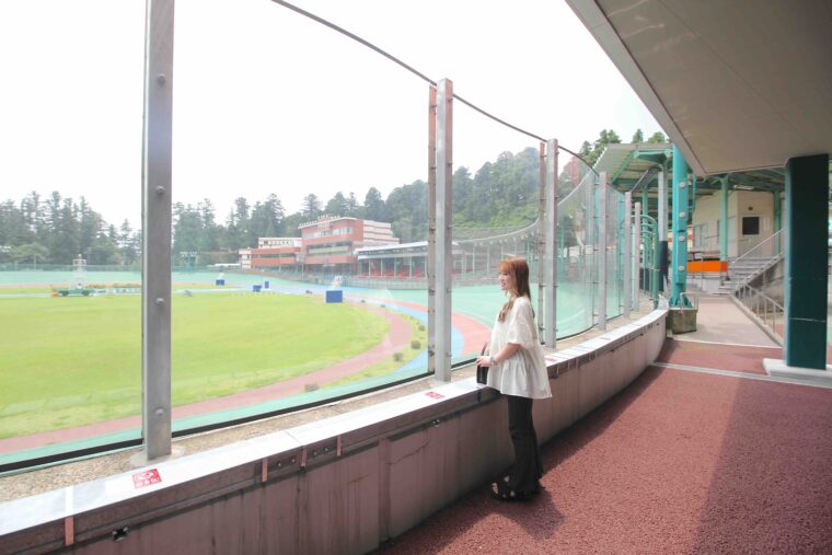 場内に入ると目の前には大きなバンクが… その大きさに圧倒されます! 少し前に大改修を行なったばかりとのことなので、場内はとってもキレイです! 渡部さんが訪れた日には、弥彦競輪場でのレースはなく、選手たちが練習に励んでいました。