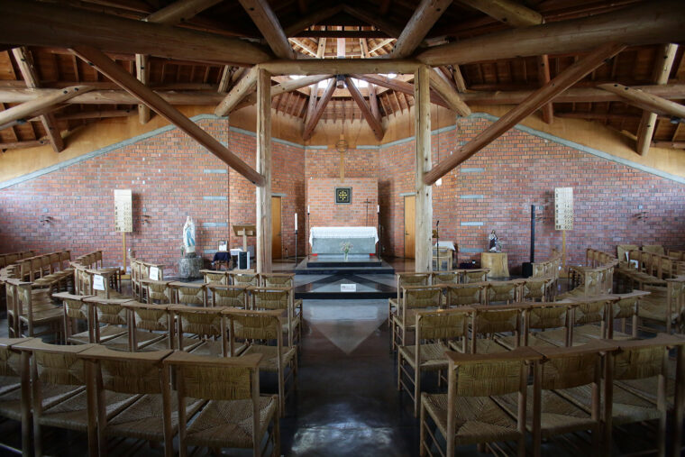 教会はおもにレンガやコンクリートを積み重ねる組積造ですが、日本の大工の技を高く評価していたレーモンドは、丸太材の組み合わせの技量に特に感心していたため、組積造と木造を掛け合わせたそう。