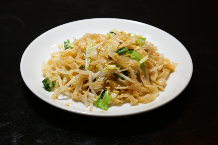 『皿オッチャホイ(並盛)』は、特注のきしめんと卵、野菜を炒め、塩、唐辛子、ニンニクでシンプルに味付けをした人気の一品。