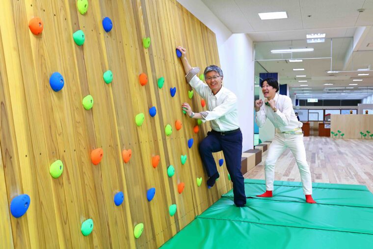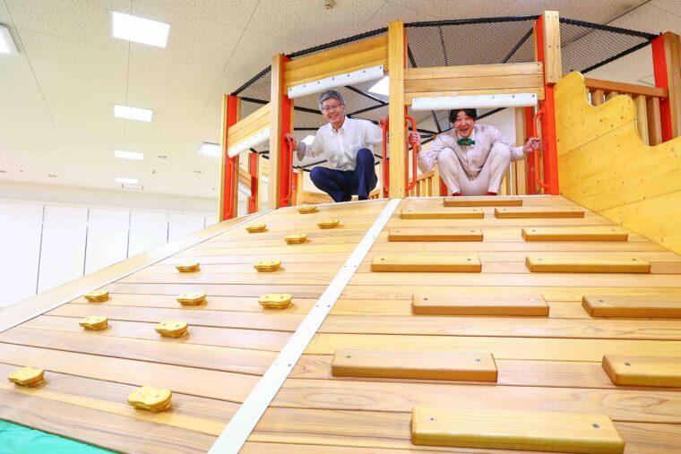思わずスーツ姿の市長を遊具にお誘いしたら「スーツが摩擦でテカテカになるよ!」と言いながらも笑顔で木育エリアで遊んでくれる市長のぬくもりもたっぷり!