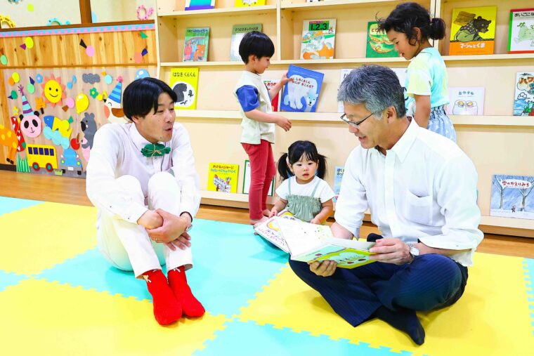 はしゃぎすぎたのでちょっと休憩ということで、静かなスペースで市長に絵本を読んでいただきゆったり。