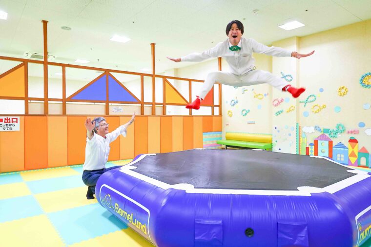 完全にキッズマジックの魔法にかかって童心に帰った僕はエアトランポリンでも両手を広げジャーーーンプ!! 自分のハイテンションくらい高く跳べて、広い広いキッズマジックを一望!