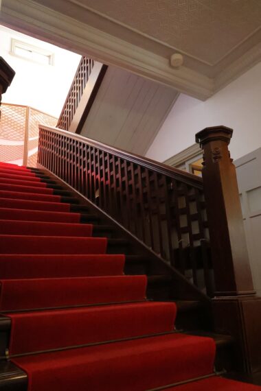 色漆喰で仕上げられた壁や珍しい回転窓、赤い絨毯が映える階段も特徴で、重厚感あふれる華やかな館内は撮影スポットとしても人気です。