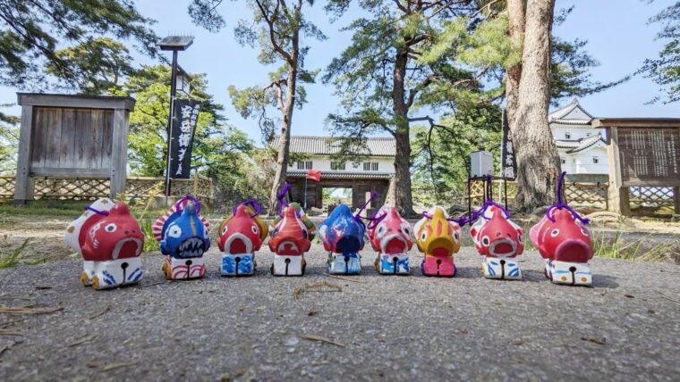 新発田城の真向かいにあるお休み処・安兵衛茶屋で、新発田の郷土玩具である金魚台輪をかたどった土鈴の絵付け体験ができます。