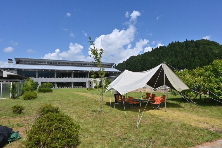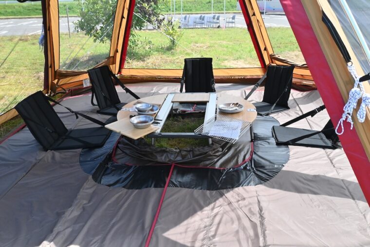 施設の脇の広大な広場に、トップメーカーのテントやタープ、カトラリーなどのキャンプ用品を使ったワンランク上のデイキャンプエリアをオープン。