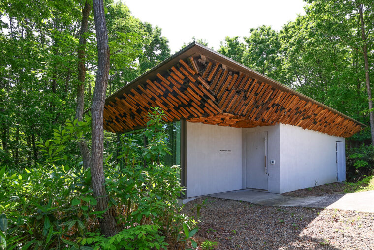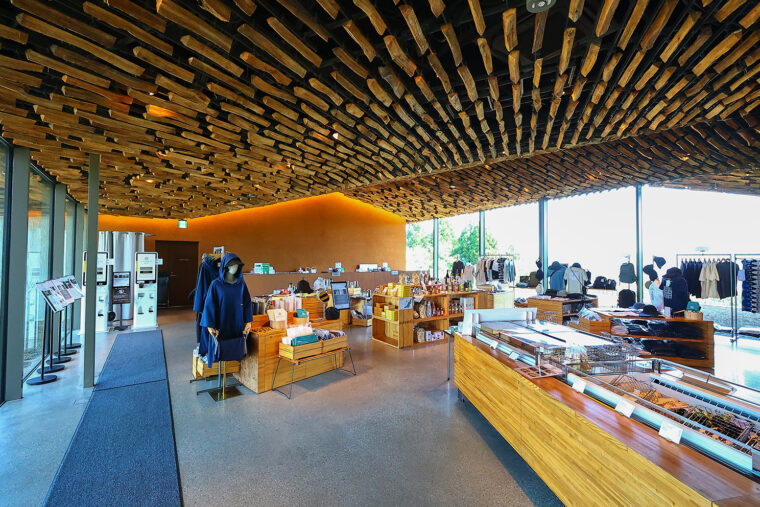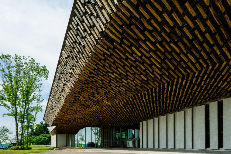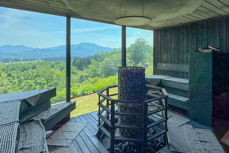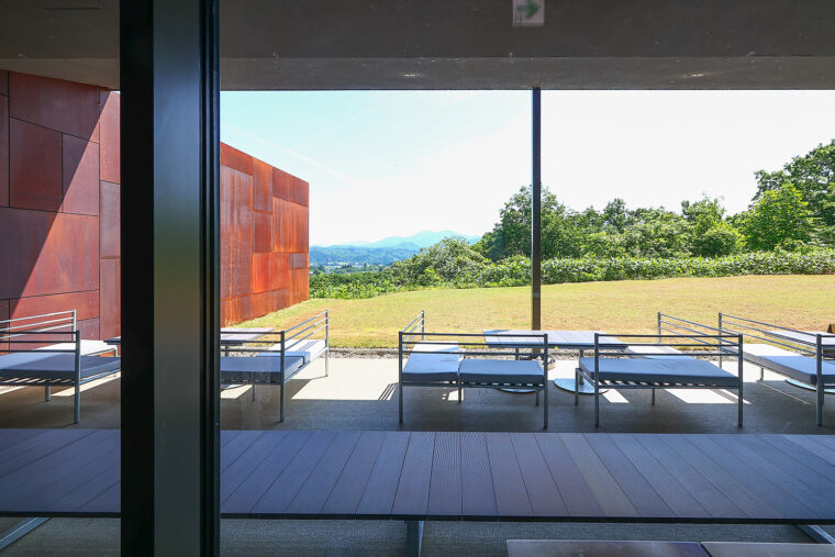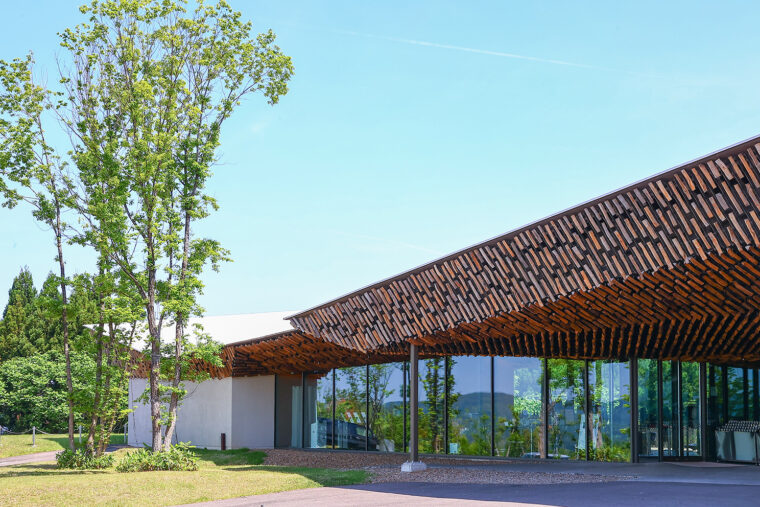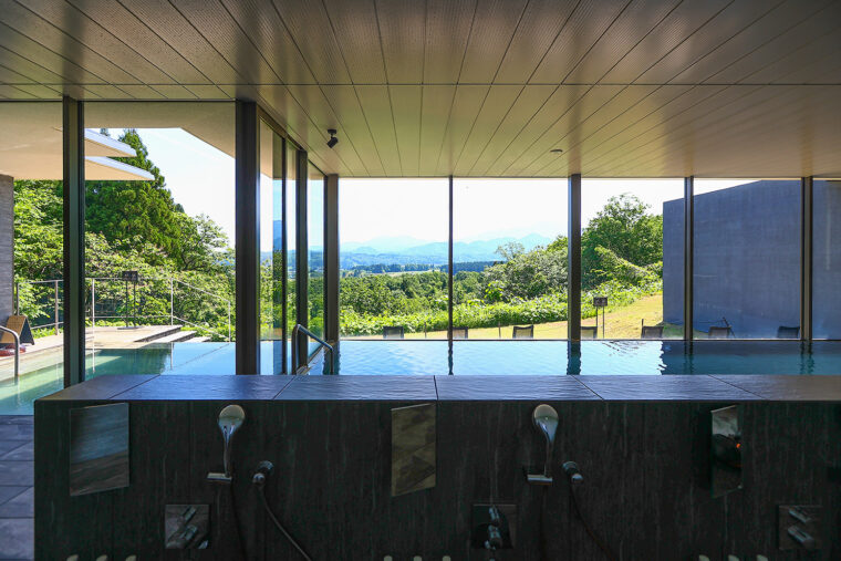 温浴施設を中心に、レストラン、宿泊施設で構成されており、粟ヶ岳を望むロケーションから着想を得たこの建物を手掛けたのは建築家・隈研吾。