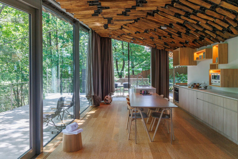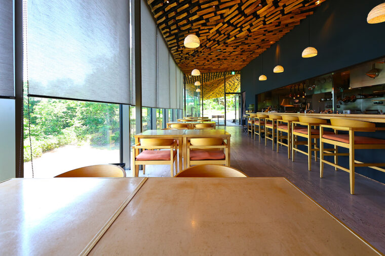 全体として屋内と屋外の隔たりを感じさせない手法を随所にちりばめ、自然との一体感を生み出しています。