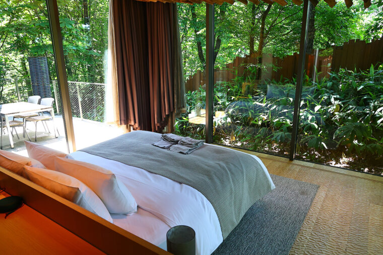 粟ヶ岳を眼前に眺めることに振り切った全面パノラマの大浴場も素晴らしいと評され、まさに「景色のいいところを切り取って見せる」という隈建築の基本原則がいかされています。