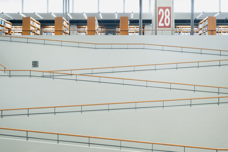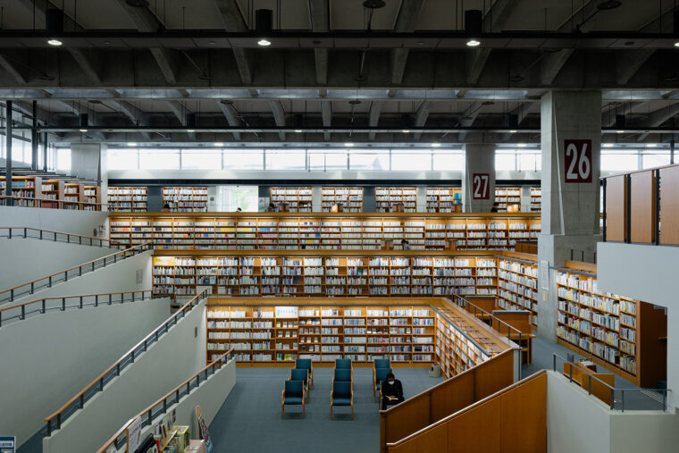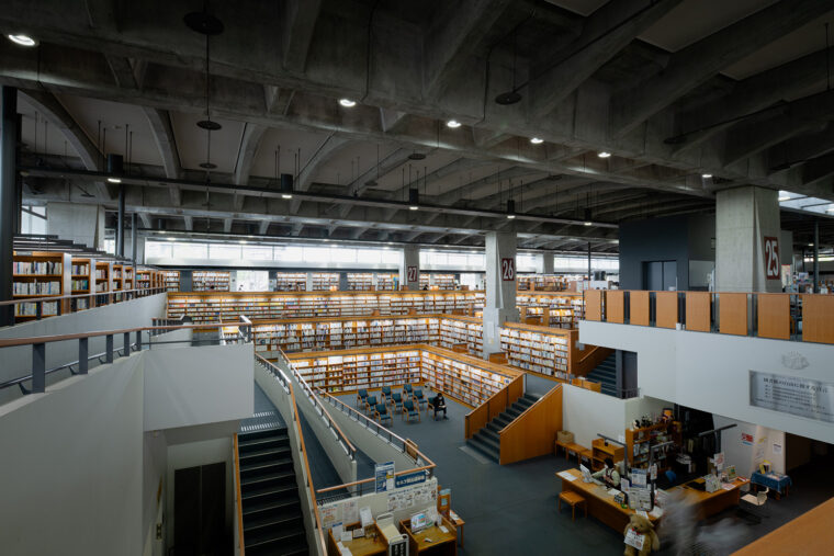 2階の仕切り壁をなくし、開架スペースを4層の吹き抜け、階段状にすることで大空間を演出しています。