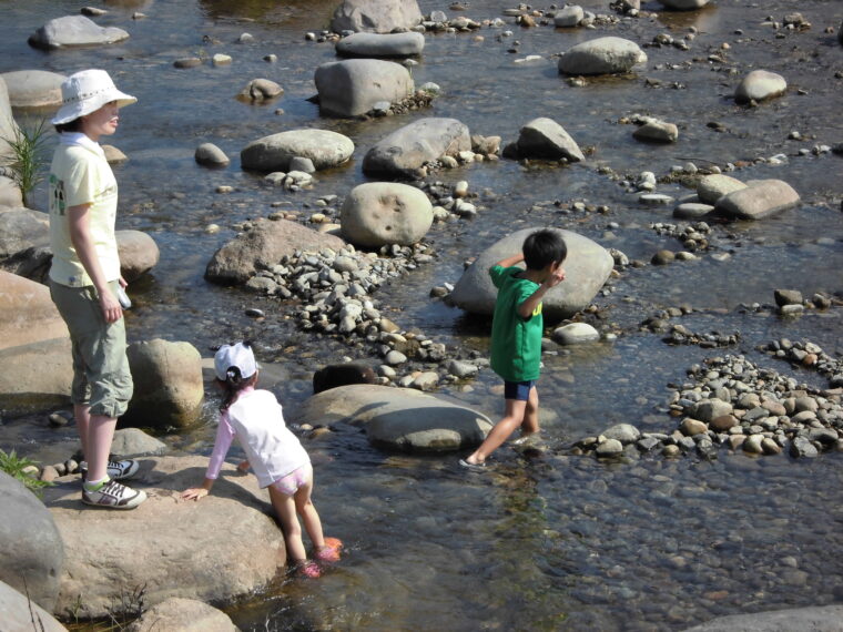 園内には、川の流れを間近に感じながら遊べる巨石親水ゾーンが整備されており、夏休みのレジャーにぴったり。大きな石の間を流れる清らかな水は、子どもから大人まで安心して川遊びが楽しめるスポットです。