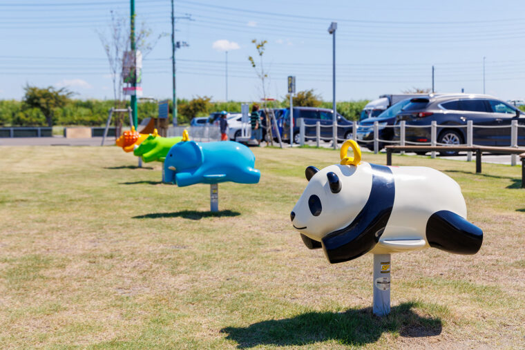 イベント時に使用できる屋外ステージや子ども向けの遊具が設置された広い空間。