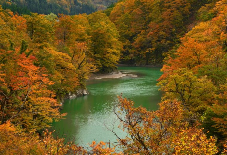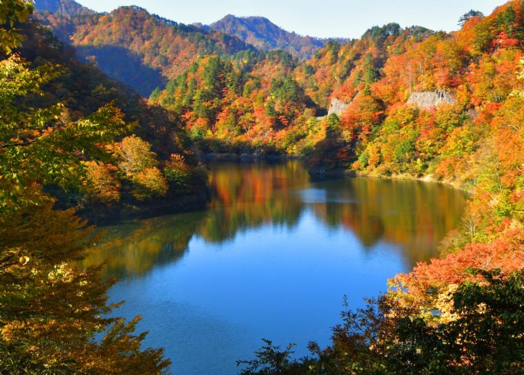奥胎内渓谷は、錦秋の彩りが水面に映える絶景スポットで、静寂に包まれた紅葉の森は、訪れる人の心を優しく染め上げます。