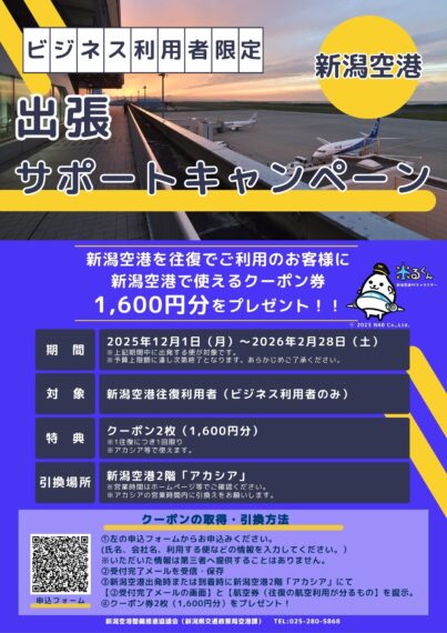 ただいま、『新潟空港 出張サポートキャンペーン』と題し、今年12月1日(月)から来年2月28日(土)まで、新潟空港往復便利用者を対象に「新潟空港で使えるクーポン券1,600円分」をプレゼント中(申し込み先着順でもれなく進呈。ただし予算上限に達し次第終了)!