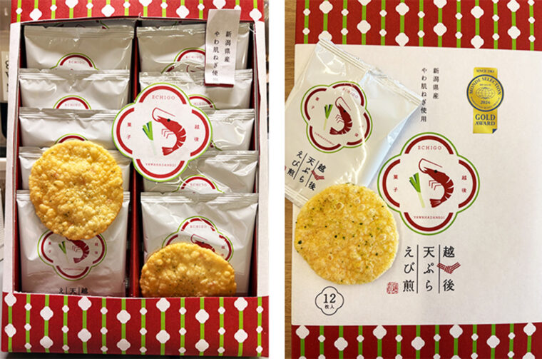 「やわらかくて甘く、雪のように艶やかで白い新潟県産やわ肌ねぎ。ふわっと広がるやわ肌ねぎと新潟県産枝豆の素材の香り、じゅわっと広がる天然エビのうまみが、風情ある味わいを醸し出す『越後天ぷらえび煎』。惜しみなく時を費やし熟成させた生地を、カラッと揚げた天ぷらエビ煎餅です」