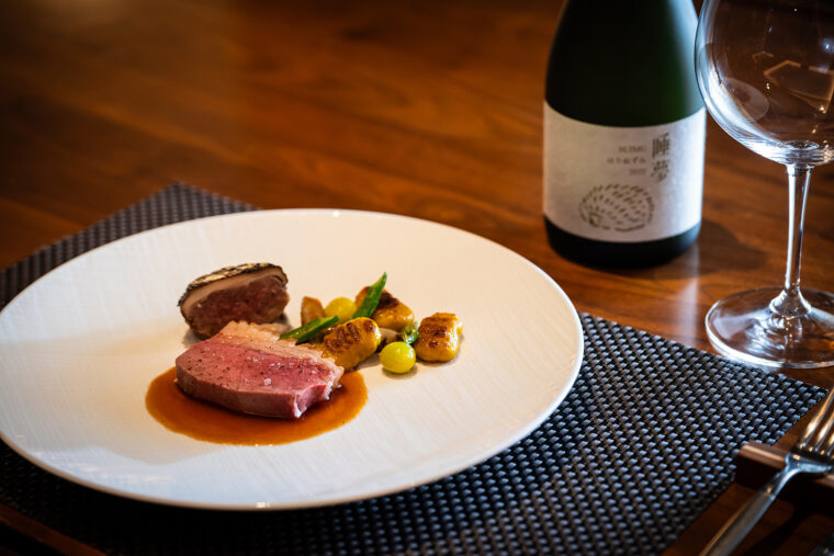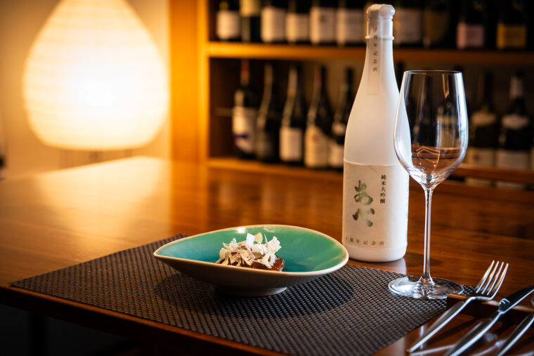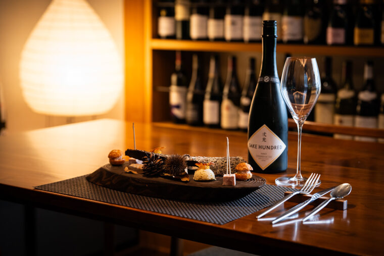 ミシュラン2つ星の店で修業を積んだ栗山昭シェフの料理に合わせ、ソムリエ・酒匠・唎酒師の資格を持つ4代目・山岸裕一さんが、ひと皿ごとに適切な一杯を選び抜き提供しています。