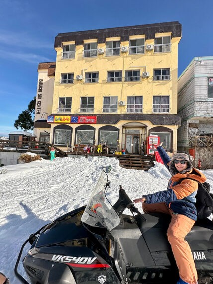 ゴンドラやリフトを乗り継いで行くと、宿のスタッフさんがなんと、スノーモービルで迎えに来てくれるんです!