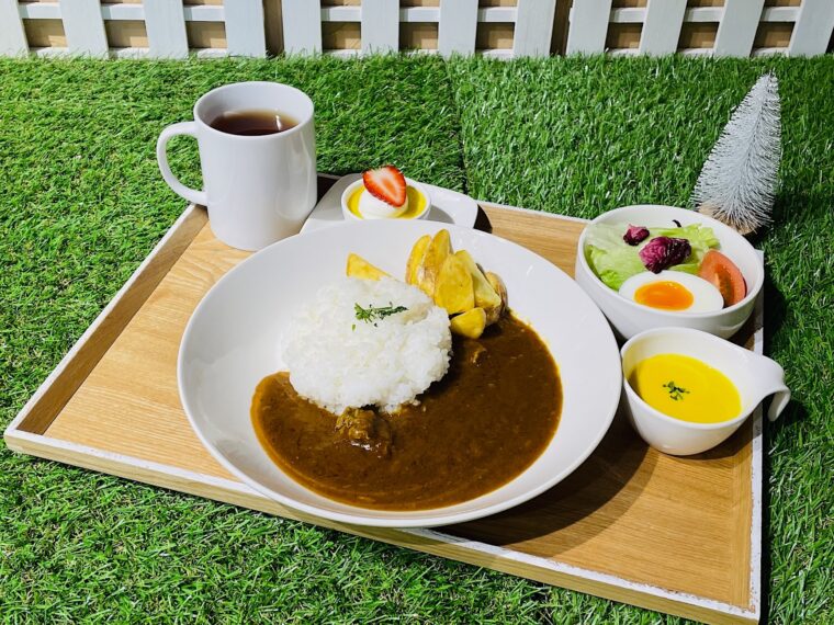 刈羽店では以前大人気だったカレーランチ(1,760円)が再登場します。赤ワインでじっくり煮込んだ牛スジデミカレーに季節のスープ、サラダ、ドリンク、ミニデザートが付いたお得なセットです。月・木・金・土・日曜の11時~ラストオーダー13時30分での提供となります。