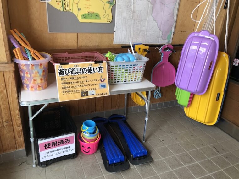 公園管理棟ではソリやスノーキックボード、バケツ、スコップなどの雪遊び道具の無料貸出を実施しています。子どもも履くことができるスノーシューは有料でレンタル可能ですよ。
