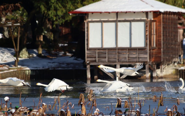 弁天潟風致公園には毎年冬になると、コハクチョウやオオハクチョウをはじめとする約200羽以上の白鳥が飛来し、静かな水辺に優雅な景色を描き出します。 天候のよい日の日中は、エサを求めて周辺の田んぼへ出かけていることが多いですが、早朝に訪れると、一斉に飛び立つ白鳥たちの姿に出合えるかもしれませんよ!
