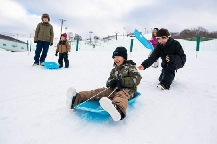 常設のキッズパークには、スキーやスノーボードの練習エリア、ソリ遊びエリアを用意。慣れたらスノーエレベーターで斜面の上まで登り、ゆっくりすべり降りてみましょう。