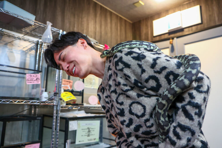 最初はおっかなびっくり、徐々に慣れて笑顔も見せたものの、首周りを這うヘビに「やっぱり怖い〜」と苦悶の表情に(笑)。
