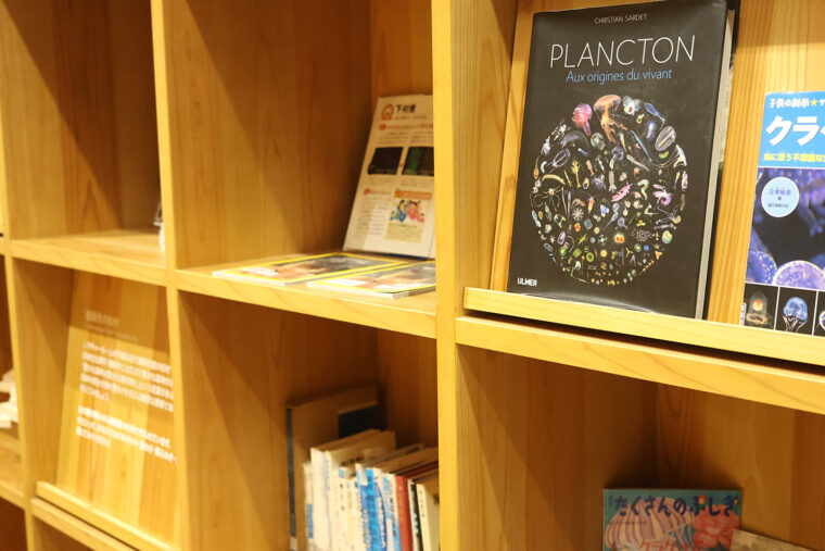 レクチャールームは、魚の図鑑や絵本など水族館ならではの書籍が並ぶ図書コーナー。