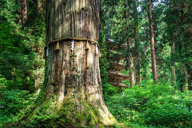 杉並木に囲まれた出羽三山神社の参道に佇む五重塔。