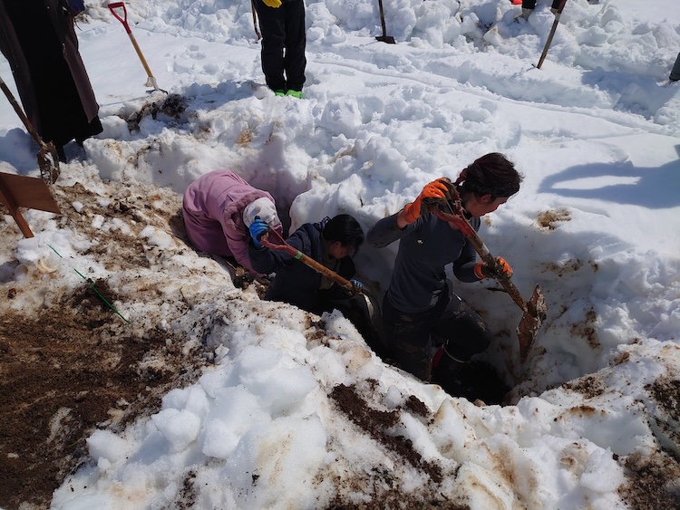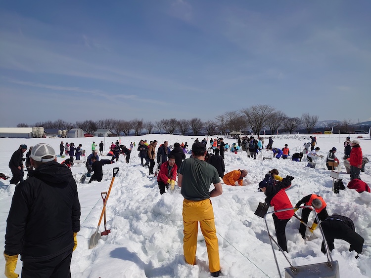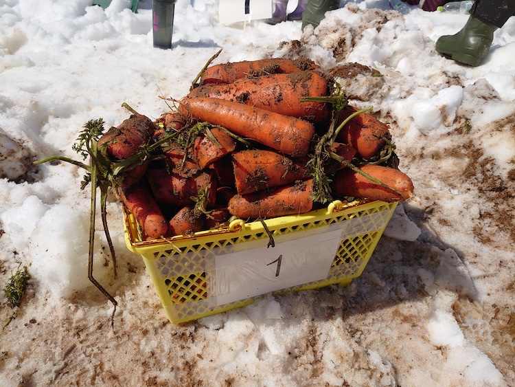この完熟にんじんを、1メートル以上の積雪が残る圃場から、制限時間内に6人1チームの人力だけでどれだけ収穫できるかを競うのが、「津南雪下にんじん掘り競争」です。