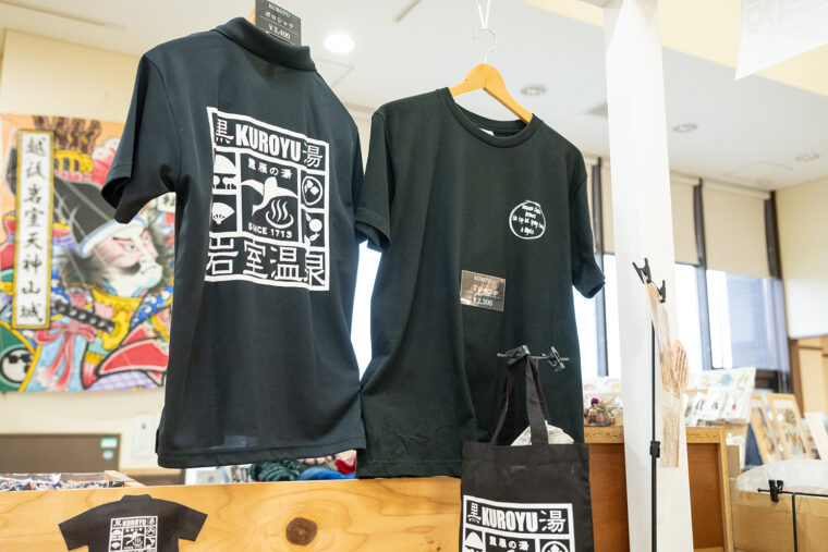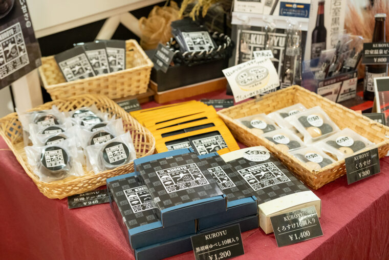 足湯で温まった後、いわむろやの館内に入ると、地元野菜や観光客向けのお土産が充実するなか、その一角に黒湯にちなんだ商品(黒湯シリーズ)の販売コーナーが。