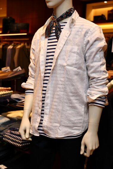 こちらはバスクシャツにリネンシャツを羽織ったシンプルなコーディネート。