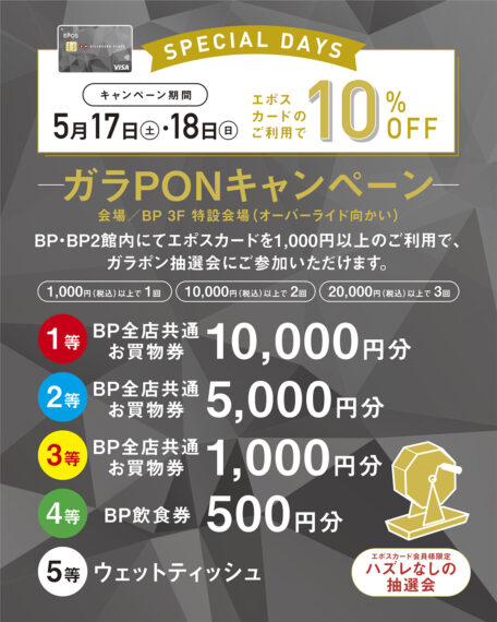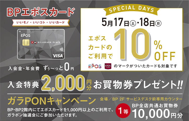 5月17日(土)・18日(日)、エポスカードの利用で館内ショップの商品が10%オフになるスペシャルイベントが開催されます。
